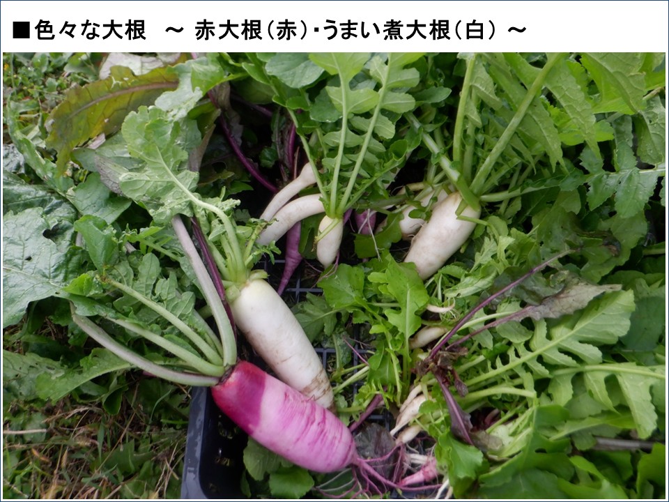 10月から新たに仲間に加わったのは、「ハツカダイコン(赤丸はつかラディッシュ)」「カブ(サラダ紅かぶ、耐病ひかり蕪、絹はだ、サラダかぶ雪の華)」「ノラボウナ」「キャベツ(カーボロネロ)」「シュンギク」です。 収穫が終わったのは、「ダイコン(赤大根、うまい煮大根)」です。