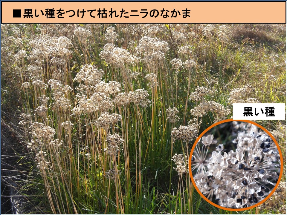 今年の秋(9~11月)の降水量は、今世紀で最少とも言われ、12月に入っても中旬までは雨がほとんど降らず、リサイクルガーデンはカラカラに乾いてしまいました。 日増しに寒さも厳しくなった冬真っ只中のリサイクルガーデンは、元は何の植物だったか判らない程に枯れて乾燥した植物や、枯れかけて薄黄緑色に変色してしまった植物達で覆われています。 そんな状況のリサイクルガーデンですが、背丈を保ったまま枯れて黒い種を付けたニラのなかまと、黄色い小穂のエノコログサのなかまや赤紫色の小穂のムラサキエノコログサのなかまがとても目立っていました。