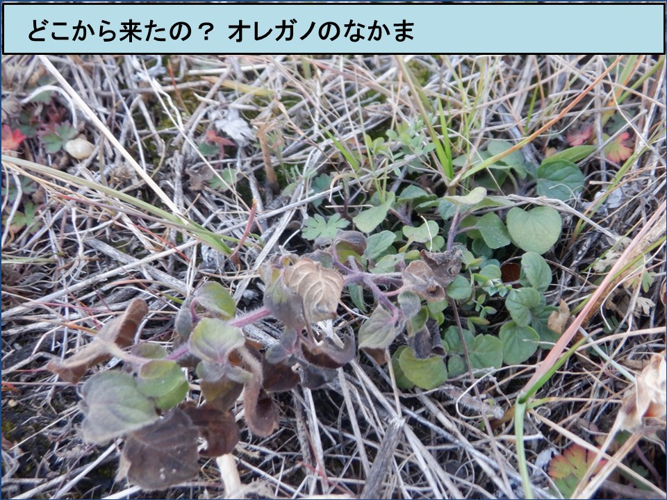 さて、どうしてリサイクルガーデンにオレガノのなかまが芽生えてきたのでしょうか? 育てやすい植物なので、最近では日本でもプランター栽培などが盛んになっているとのことなので、鳥が運んできたのでしょうか? しかしオレガノの実は、鳥の好む赤い実や果肉のある実ではないので、果肉を食べて運ぶ「食散布」の可能性は低そうです。 もしかすると風でこぼれ種が飛ばされてきたのかもしれません。 ガーデンで見つけたオレガノのなかまは、まだ芽生えたての様子。 まわりに同じような葉は見られませんでした。 すくすくと育ってほしい気持ちもありますが、オレガノのなかまは地下茎で急速に広がり、非常に強健と言われていますので、他の植物のためにも繁殖しすぎにならないよう、お願いしたいものです。