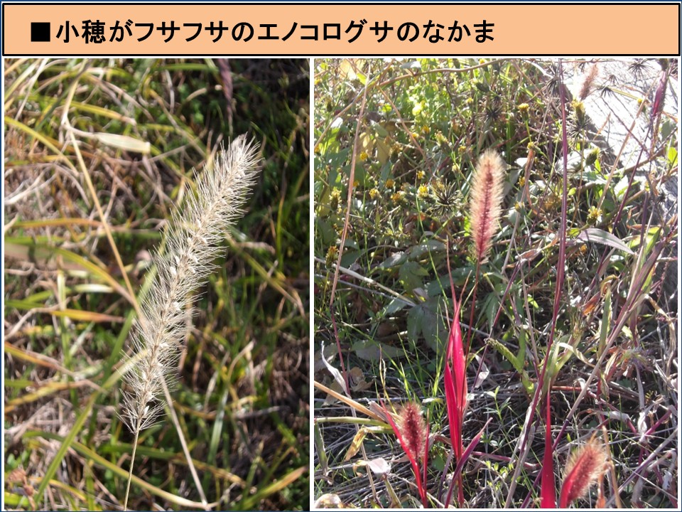 今年の秋(9~11月)の降水量は、今世紀で最少とも言われ、12月に入っても中旬までは雨がほとんど降らず、リサイクルガーデンはカラカラに乾いてしまいました。 日増しに寒さも厳しくなった冬真っ只中のリサイクルガーデンは、元は何の植物だったか判らない程に枯れて乾燥した植物や、枯れかけて薄黄緑色に変色してしまった植物達で覆われています。 そんな状況のリサイクルガーデンですが、背丈を保ったまま枯れて黒い種を付けたニラのなかまと、黄色い小穂のエノコログサのなかまや赤紫色の小穂のムラサキエノコログサのなかまがとても目立っていました。