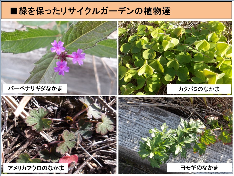 枯れた植物達に覆われたリサイクルガーデンですが、その根元で緑を保って成長中の植物達(ヨモギ、カタバミ、アメリカフウロなどのなかま)を見つけました。 春になるまで枯れた植物の下で寒さにジーっと耐えながら待つのだろうな~。 その他にもリサイクルガーデンの淵の木枠付近に、季節外れのバーベナリギダの青紫色の花が、そ~っと顔を覗かせるように咲いていました。