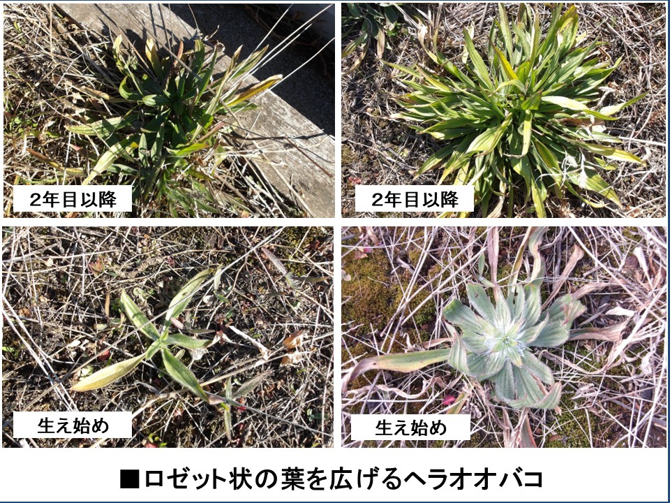 4種類目は、「ヘラオオバコ」です。 ヘラオオバコも多年草で、春から夏にかけてロゼット状の葉の中から長い花茎を伸ばして花を咲かせ、秋に種を飛ばしてから長い花茎は倒れ、再びロゼット状の葉だけになります。