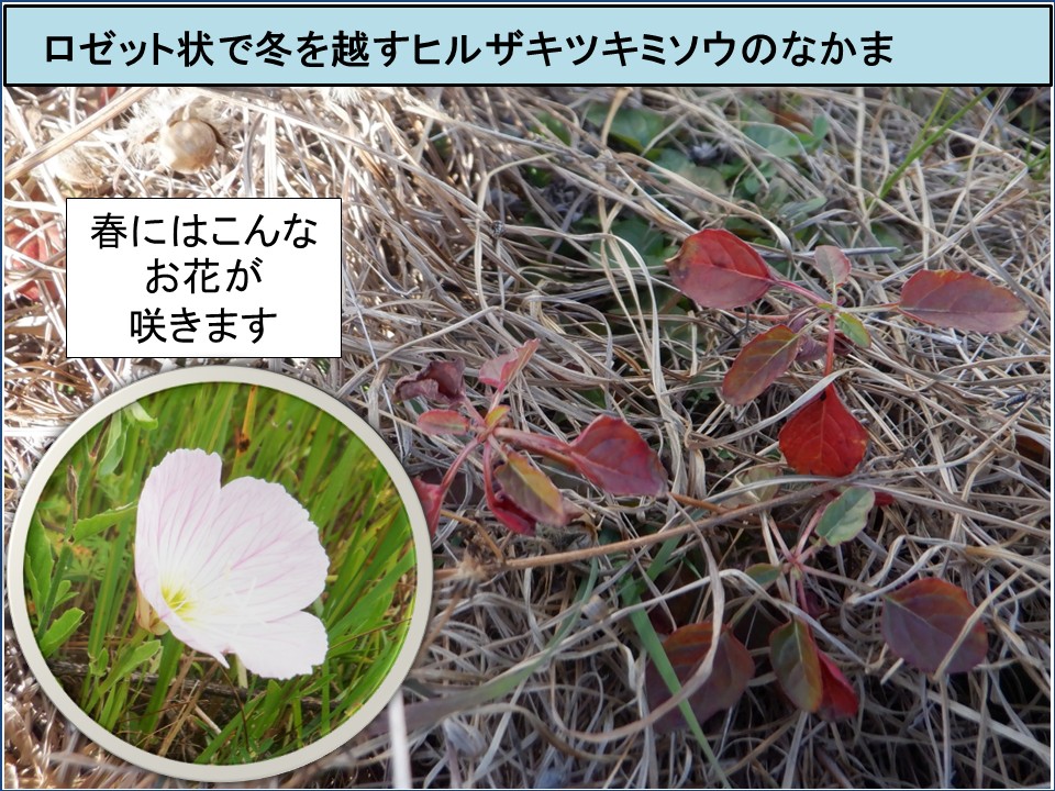 さて、同じく地下茎で繁殖する植物に、ヒルザキツキミソウのなかまがあります。 ヒルザキツキミソウのなかまは多年草なので、昨年と同じ場所でロゼット状になった葉を見つけました。 緑色の葉の一部を紅葉させ、枯草の下で赤と緑のグラデーションの葉を広げています。 もう少し暖かくなったらロゼット状の葉をグッと上へ伸ばし、4月下旬には薄ピンク色の花を咲かせることでしょう。